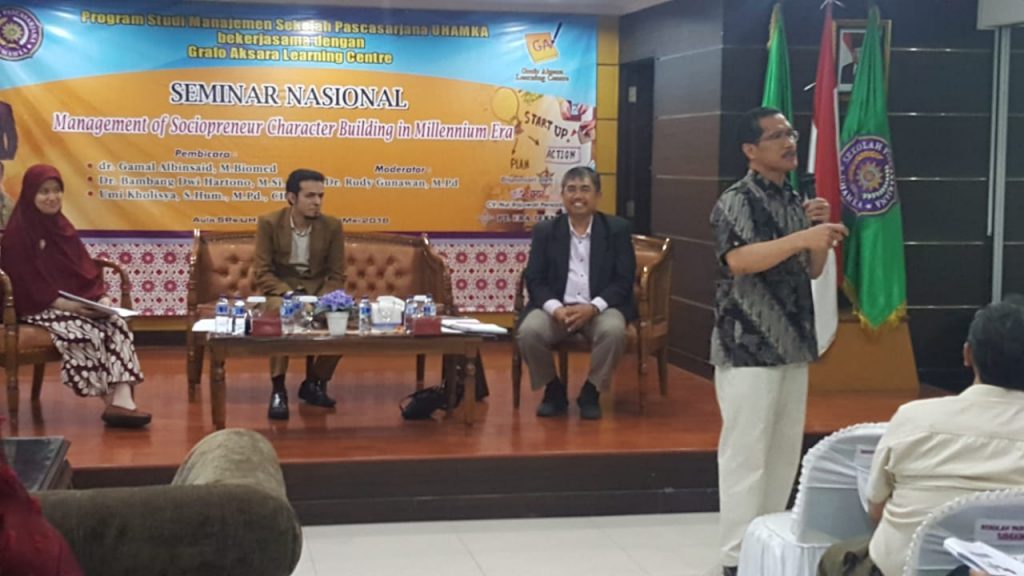 Seminar Nasional ini untuk membuka wacana dan sebagai inspirasi bagi masyarakat, baik akademisi, praktisi, yang memiliki semangat untuk membantu dan bergotong royong menanggulangi masalah sosial masyarakat di sekeliling kita, yang pada akhirnya dapat meningkatkan kesejahteraan manusia. Seminar ini dilaksanakan di Sekolah Pascasarjana UHAMKA pada 12 Mei 2018. Seminar ini terlaksana atas kerjasama Program Studi Manajemen Sekolah Pascasarjana UHAMKA dengan Grafo Aksara Learning Centre. Dengan 3 pembicara yang berkompeten dibidangnya yaitu Dr. Bambang Dwi Hartono, M.Si. (Ketua